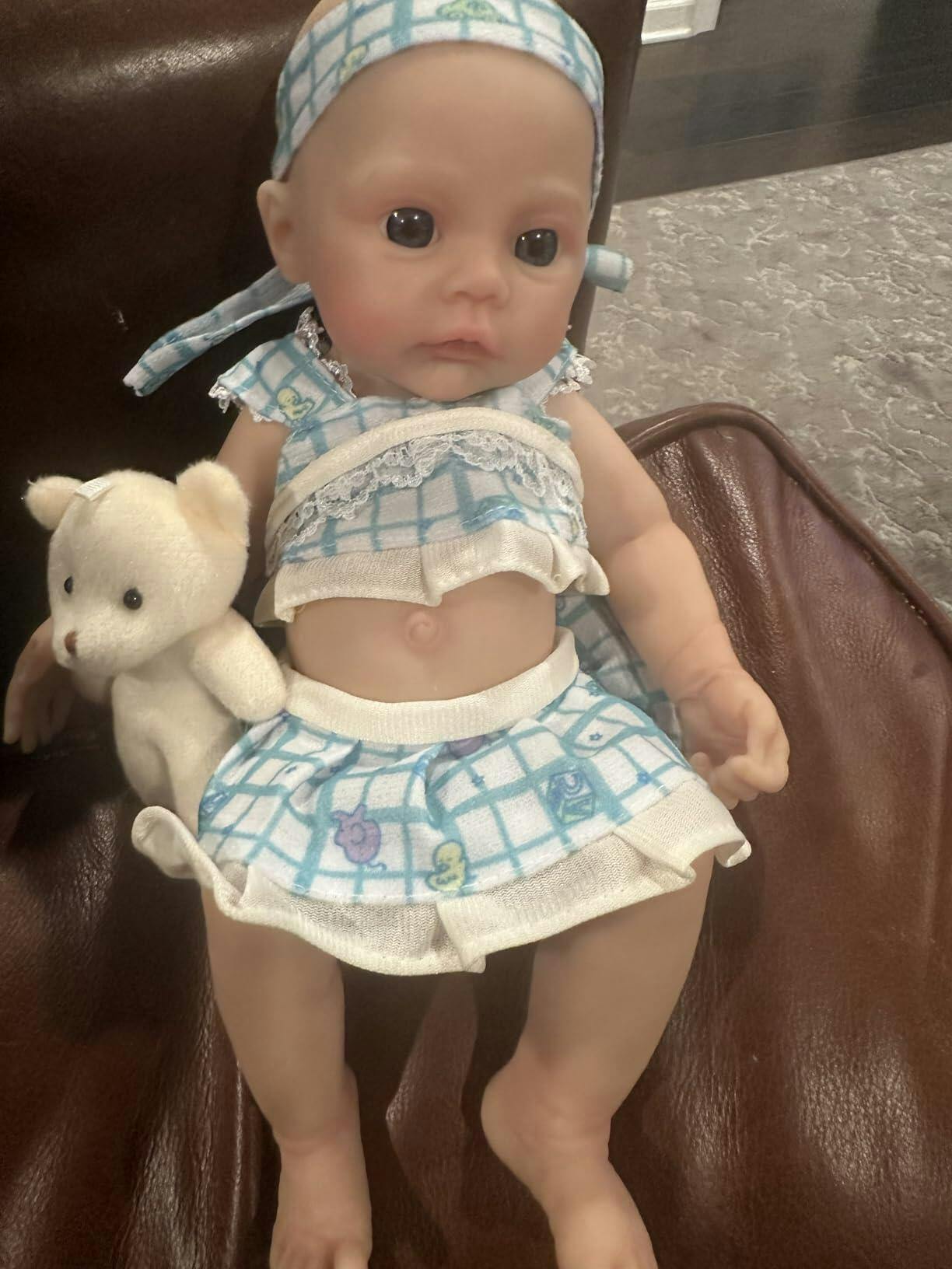 Bébé reborn fille de 30 cm en silicone vêtue d'une robe bleue à fleurs