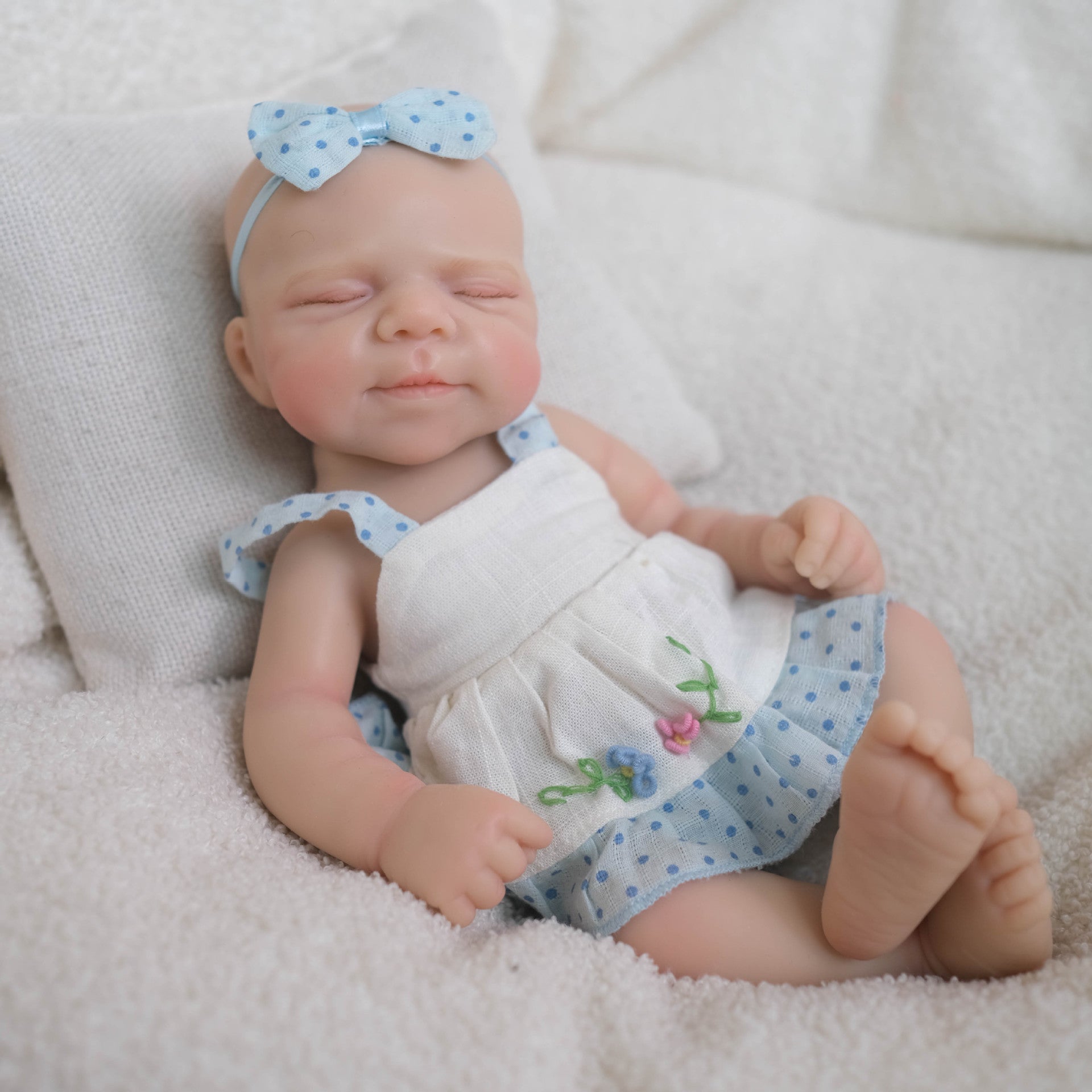 Bébé reborn Pascale en silicone de 20 cm fille vêtue d'une robe bleue