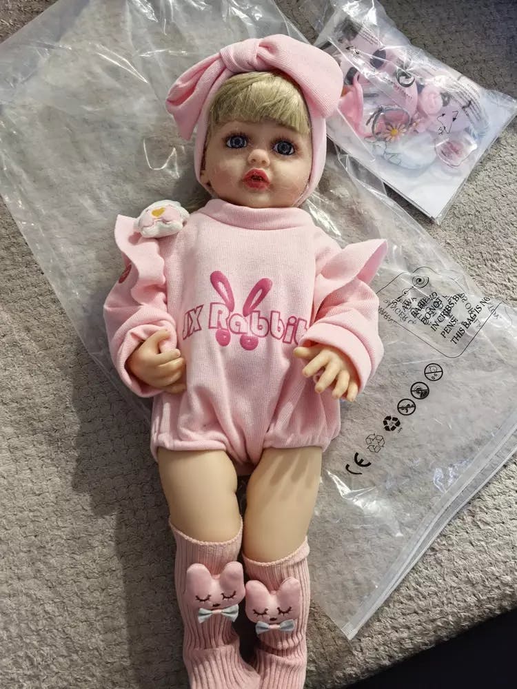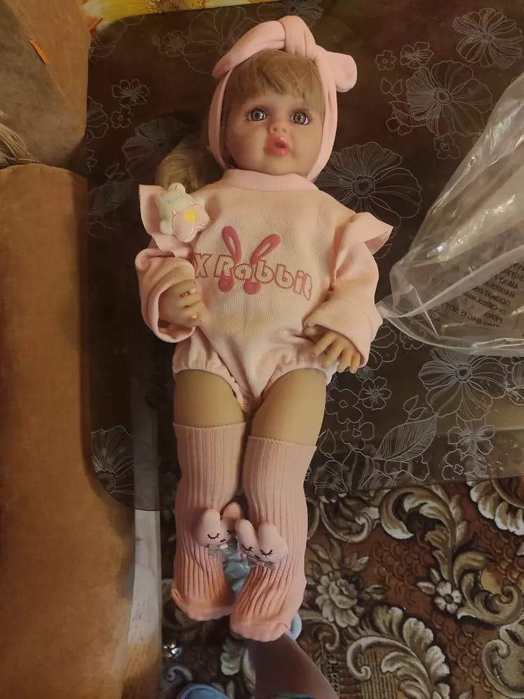 Reborn fille blonde de 55 cm yeux ouverts cheveux longs en body rose - Betty