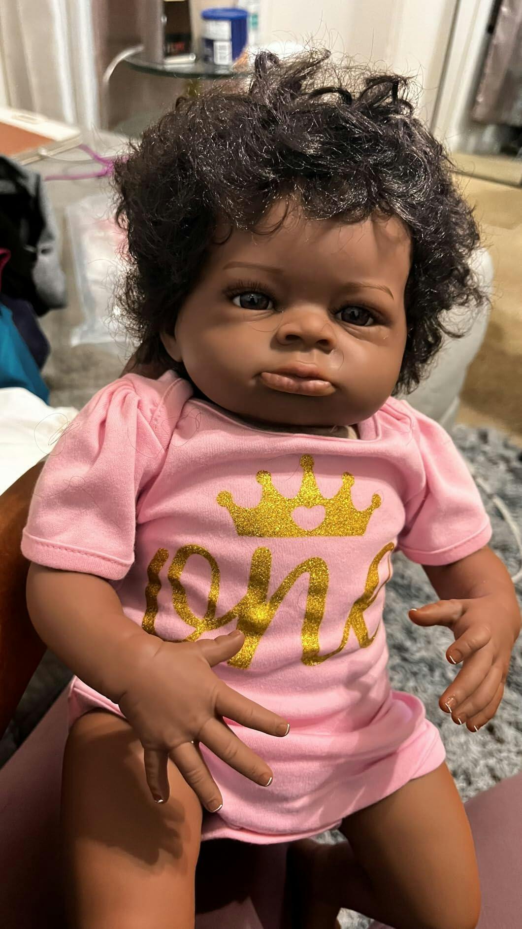 Poupée Reborn Lanny de 48 cm yeux ouverts peau foncée cheveux bouclés