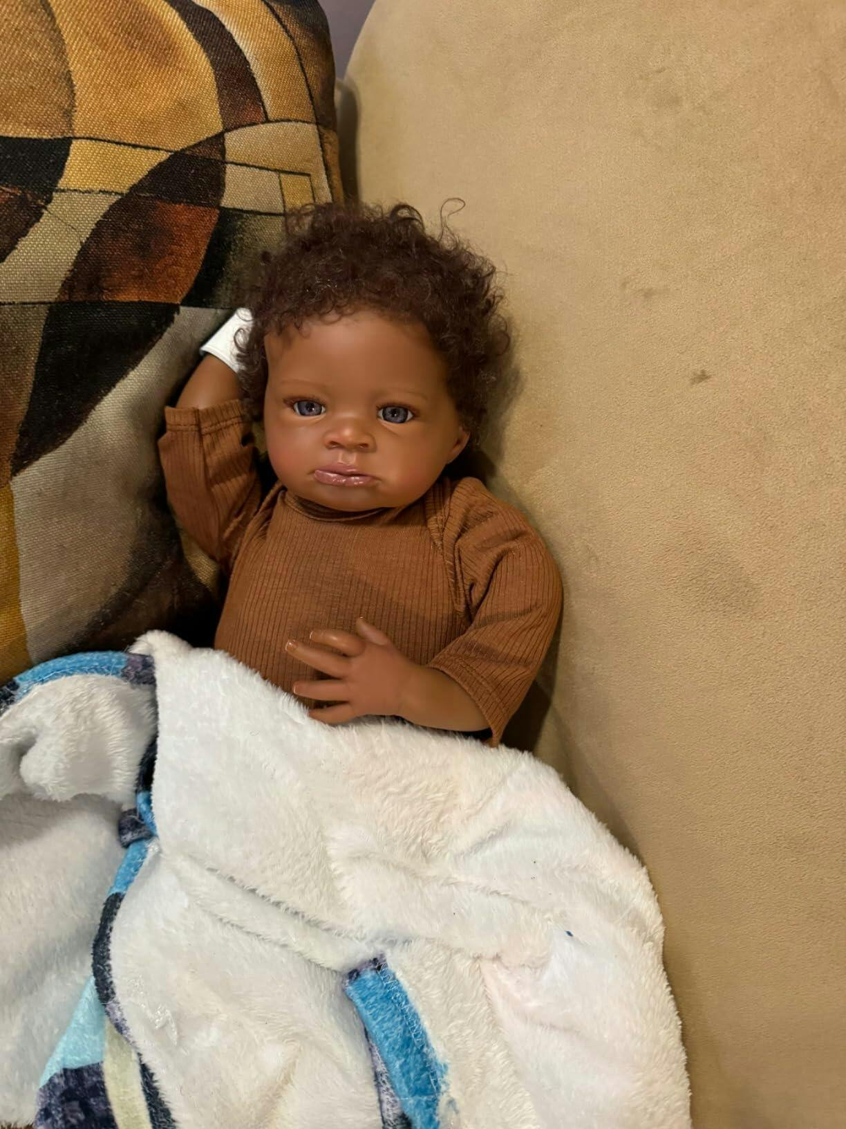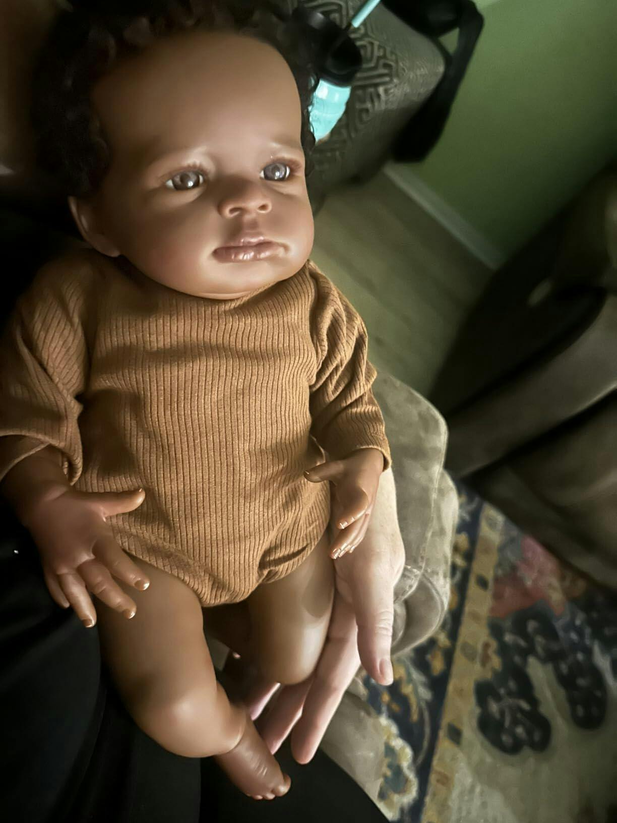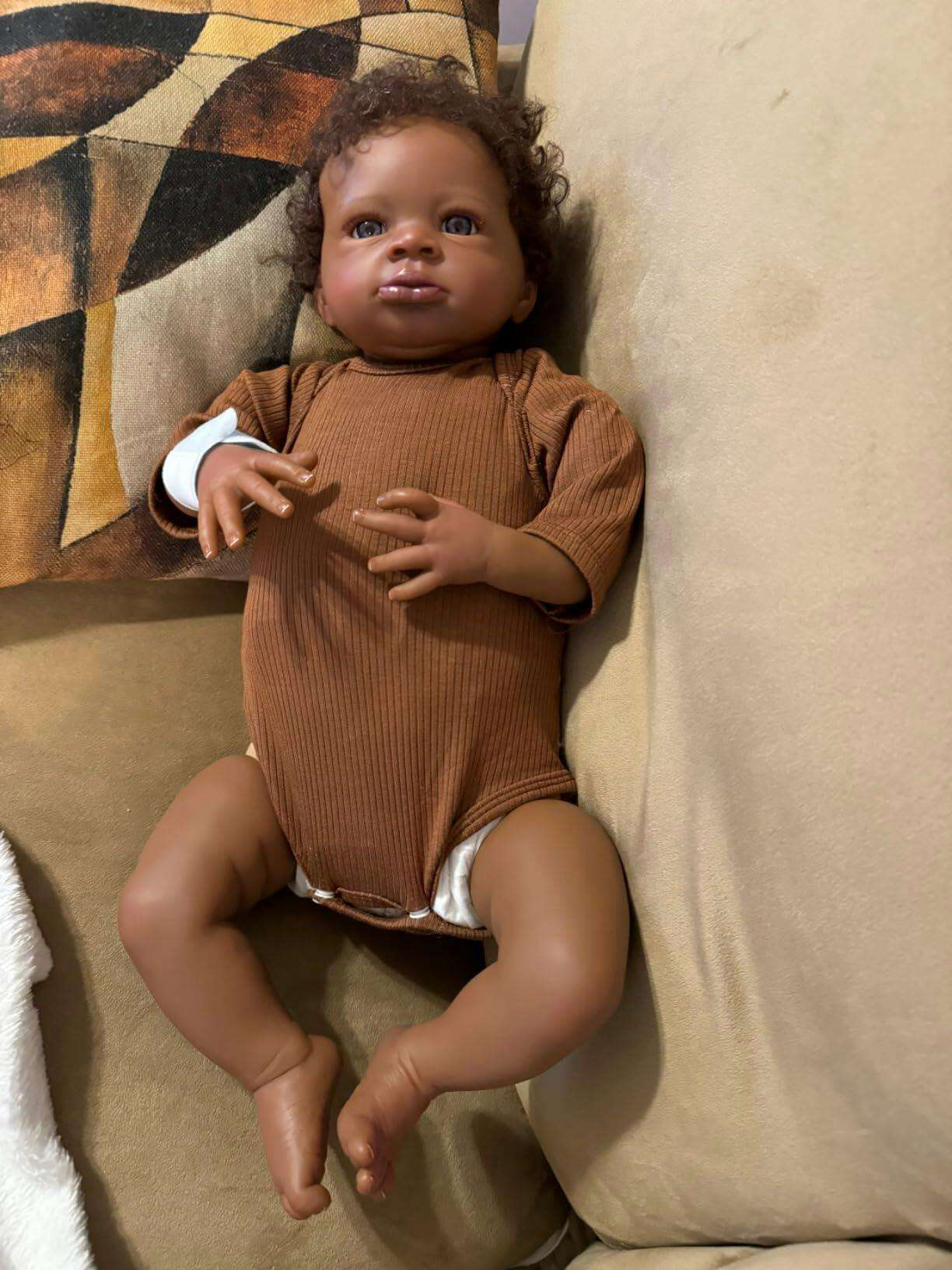 Poupée Reborn de 20 pouces aux yeux ouverts peau foncée cheveux bouclés vêtements marron - Lanny