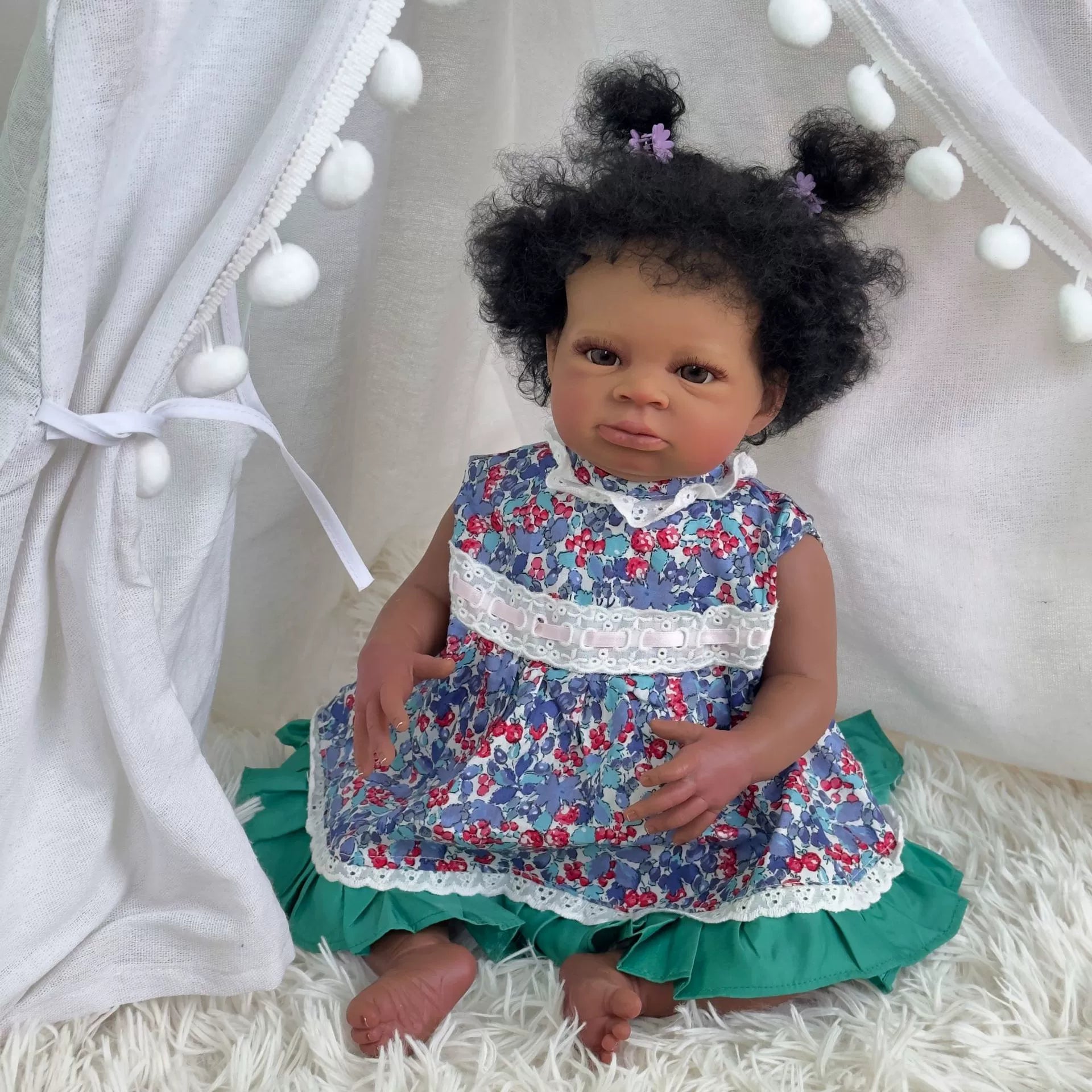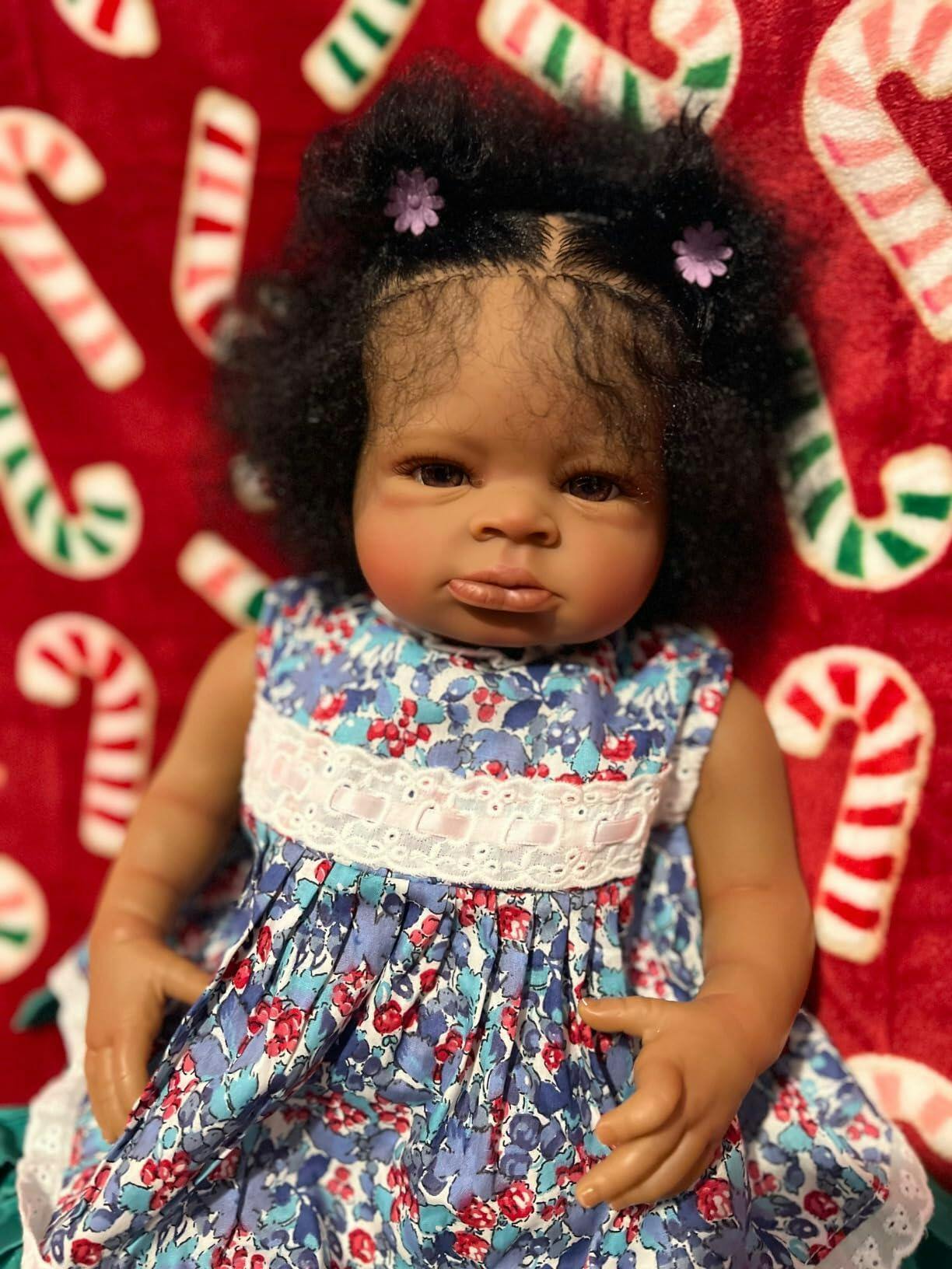 Poupée Reborn de 50 cm yeux ouverts peau foncée cheveux bouclés robe fleurie – Lanny