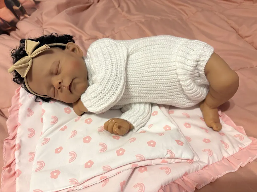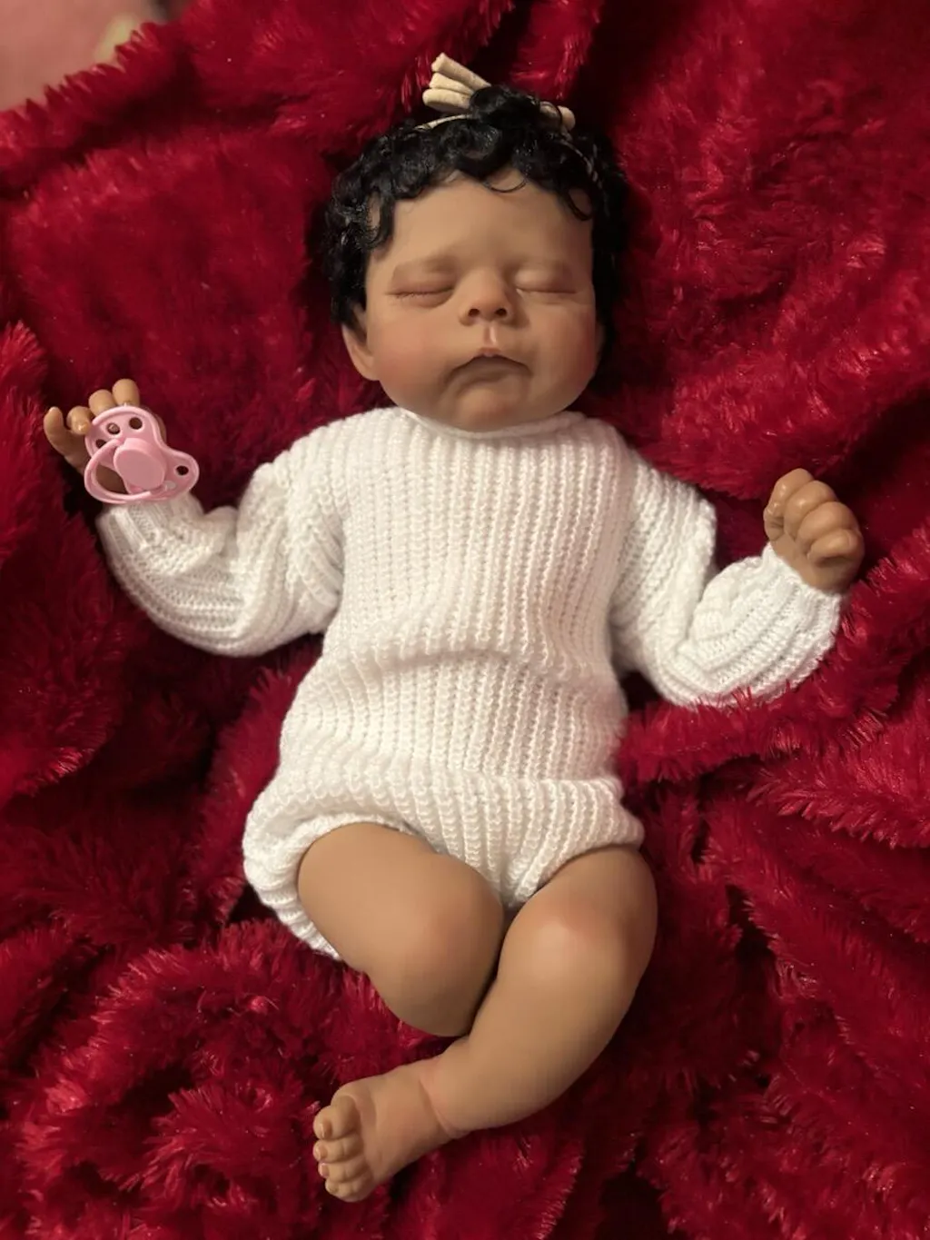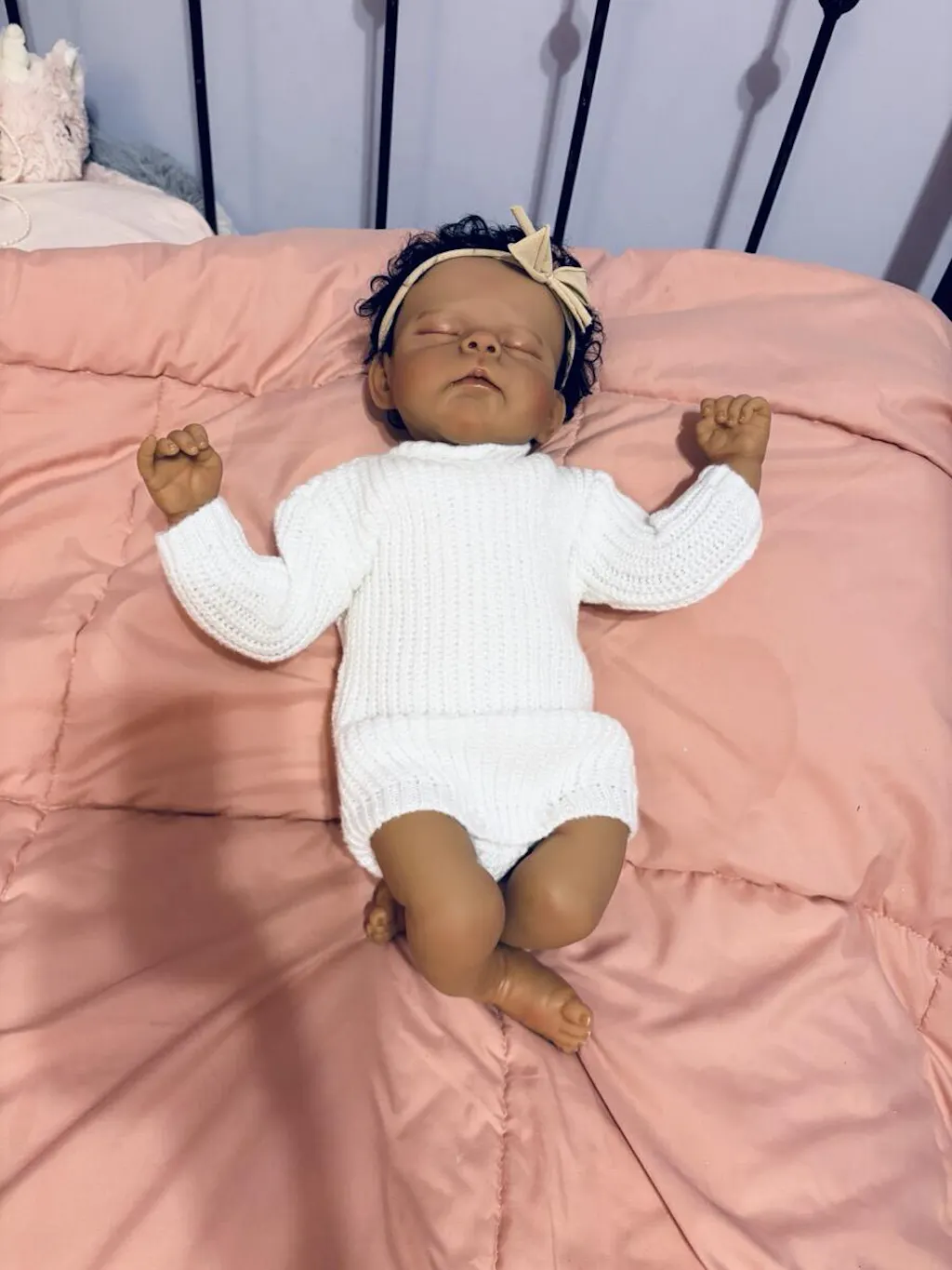 Poupée reborn Eric de 50 cm yeux fermés peau foncée cheveux courts vêtue d'un pull blanc