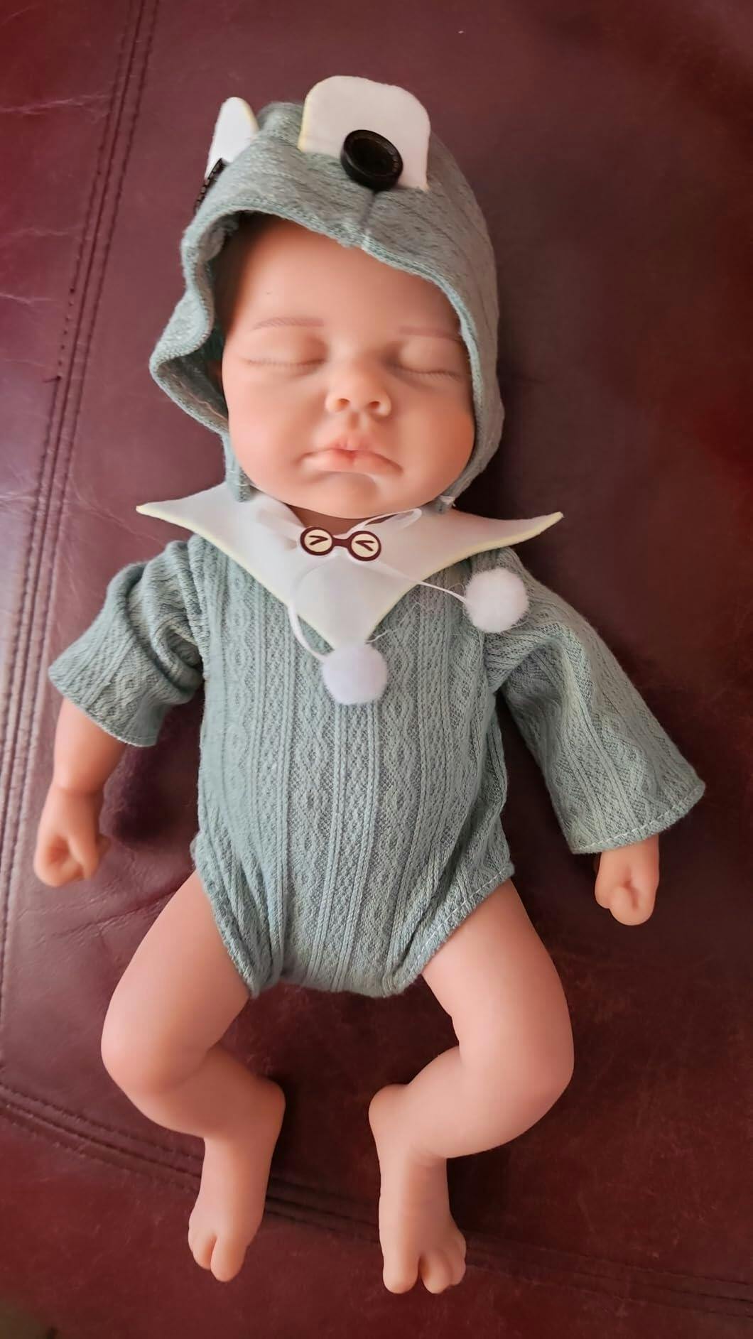 Poupée reborn Loulou de 30 cm entièrement en silicone yeux fermés vêtue de vêtements verts