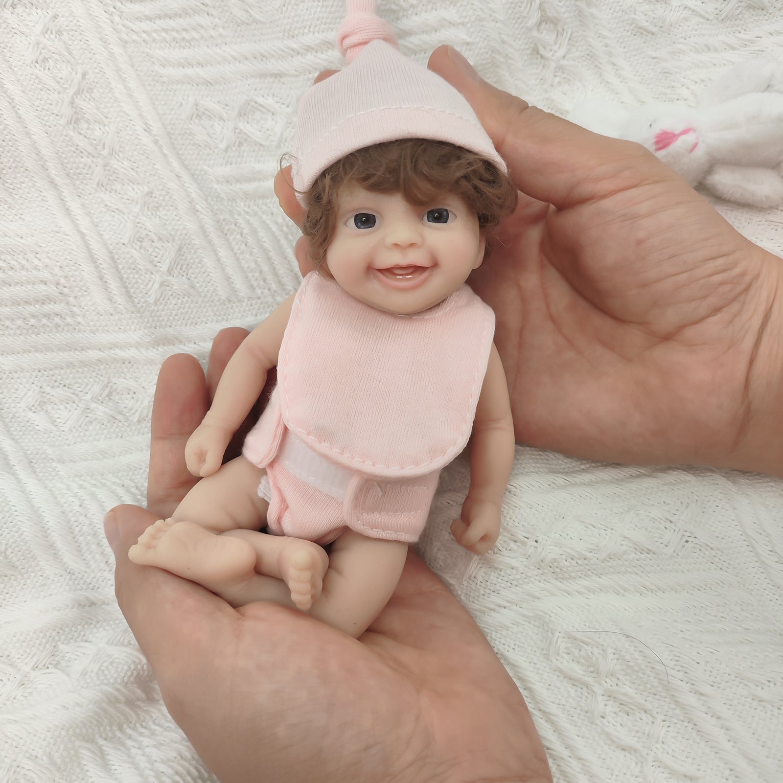 Mini poupée Reborn entièrement en silicone avec yeux ouverts de 15 cm et vêtements roses
