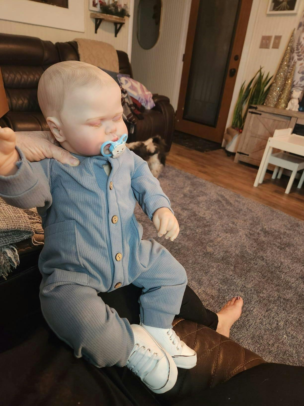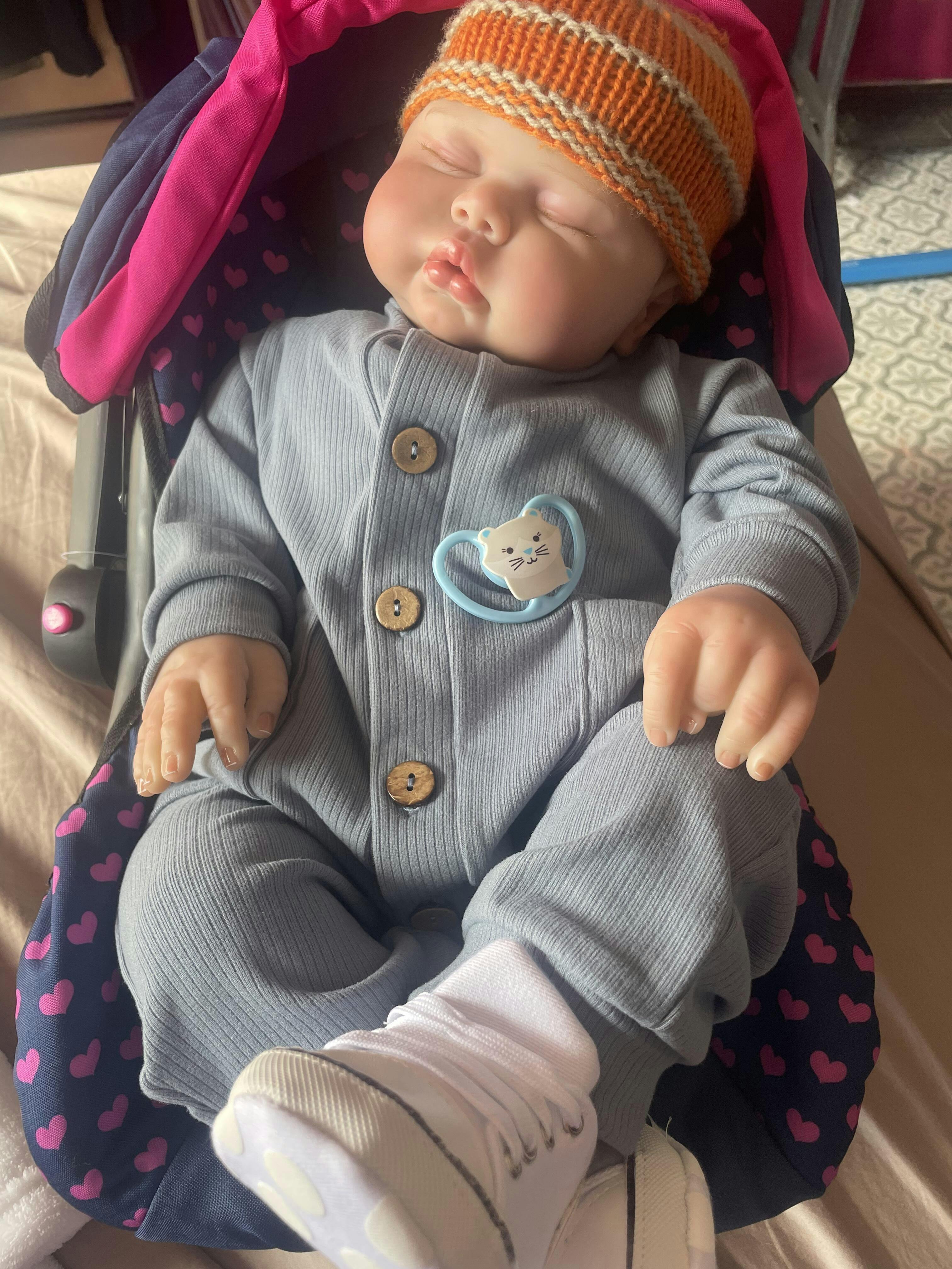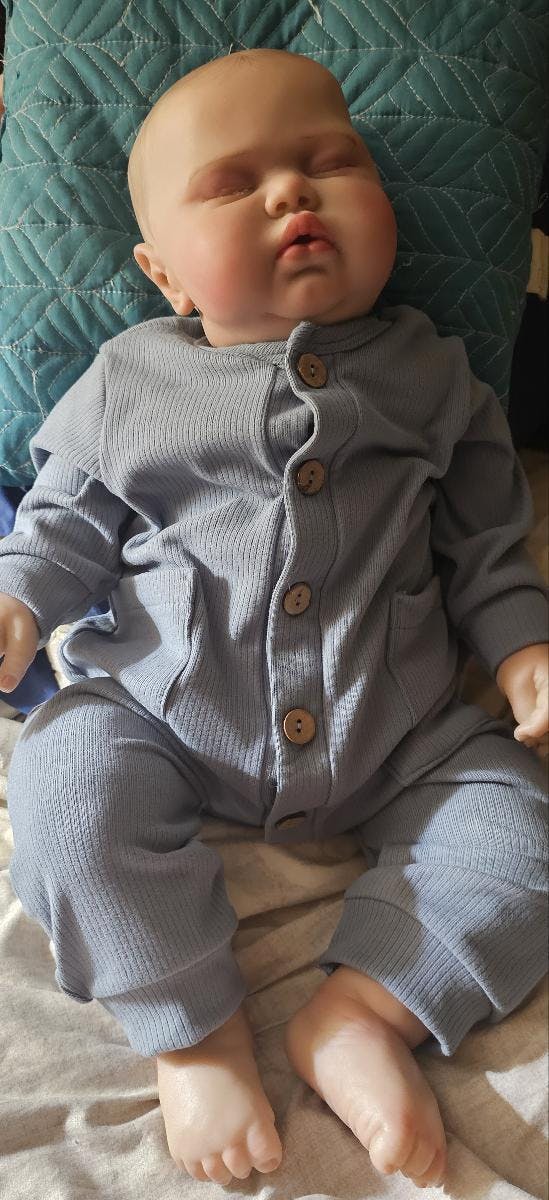 Il est adorable ! Très réaliste. Un vrai petit bébé potelé. Sa fontanelle est réaliste. Ses cheveux sont peints. J'adore le fait que ses membres soient articulés. Il correspond à la taille 6-9 mois. Ravie ❤️